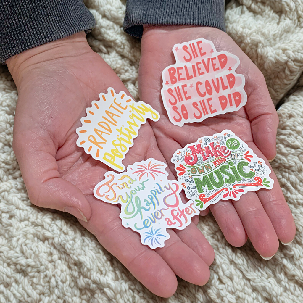 Pictured is a sample of what you could receive in your mystery pack. These surprise sticker packs could include examples such as: She Believed She Could, Tea Time, Don't Forget the Happy Thoughts, Follow Your Heart, Make Your Own Music, Always Be Kind, So you fight until you can't fight anymore, Enjoy the little things, Love, Joy, Peace..., Keep Moving Forward, and so many others!